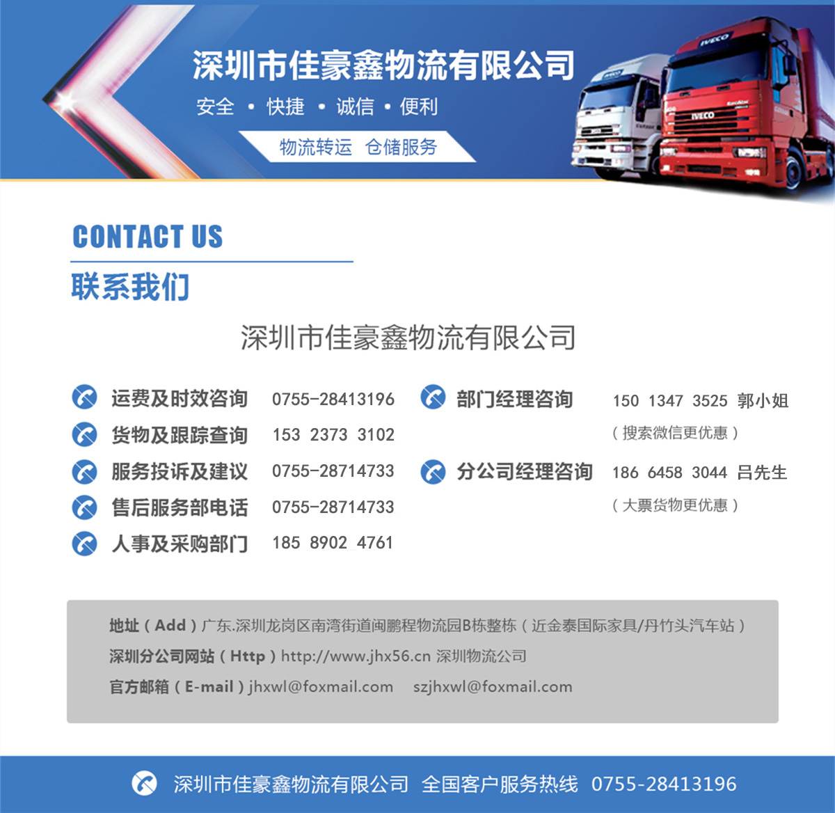 投訴建議大票貨物聯系人:呂太濱 186 6458 3044 (分公司負責人) 投訴郵箱:szjhxwl@foxmail.com QQ:2425174659
